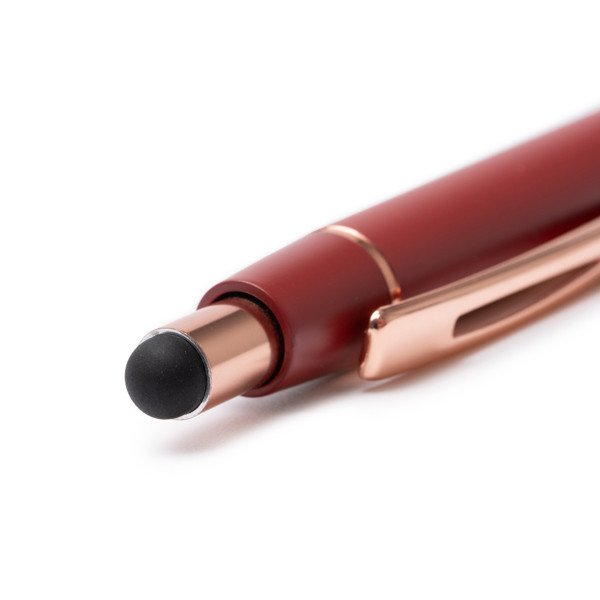 Bolígrafo metálico LEIVA con acabado mate, detalles en cobre y puntero táctil. Personalizable con grabado láser para empresas y regalos corporativos exclusivos.