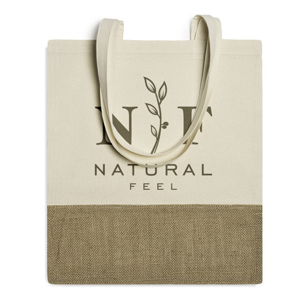 La bolsa de algodón WAVE es una opción elegante y respetuosa con el medio ambiente. Confeccionada en algodón y yute, presenta un diseño atractivo con una banda de yute. Sus asas largas proporcionan comodidad mientras llevas tus compras. Perfecta para cualquier ocasión.