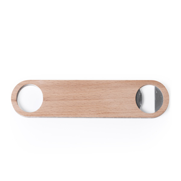 El Abridor SHAKE combina madera natural y acero inoxidable, con un diseño alargado y práctico. Con orificios en ambos extremos para abrir y colgar, es perfecto para el uso diario. Medidas: 17.9 cm x 4 cm.