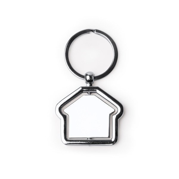 Llavero TUDOR metálico con cuerpo giratorio en forma de casa y amplia zona de marcaje, ideal como regalo corporativo promocional.