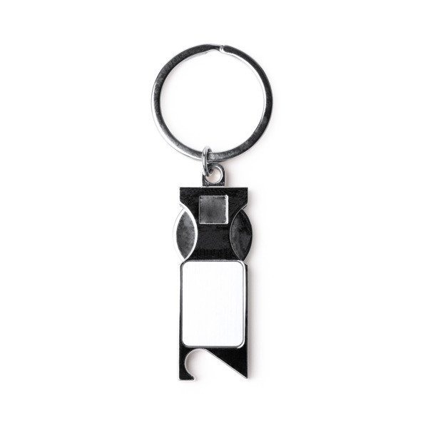 Llavero LIBOK metálico con moneda extraíble para carro y abridor integrado, un artículo práctico para merchandising corporativo.