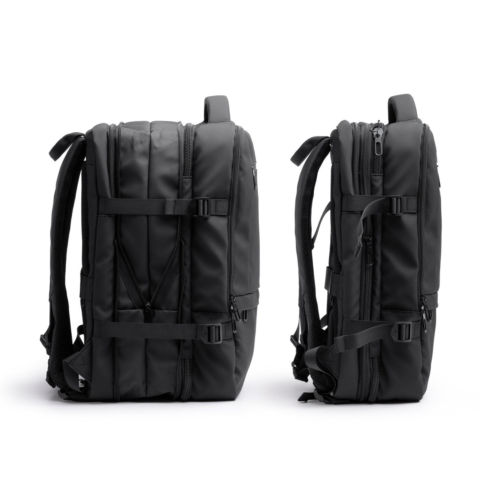 Mochila RAYAN, fabricada en PU Leather, con capacidad extensible de 40L, compartimento acolchado para laptops de 17", bolsillos antirrobo y cinta para trolley. Comodidad y seguridad en un diseño elegante.
