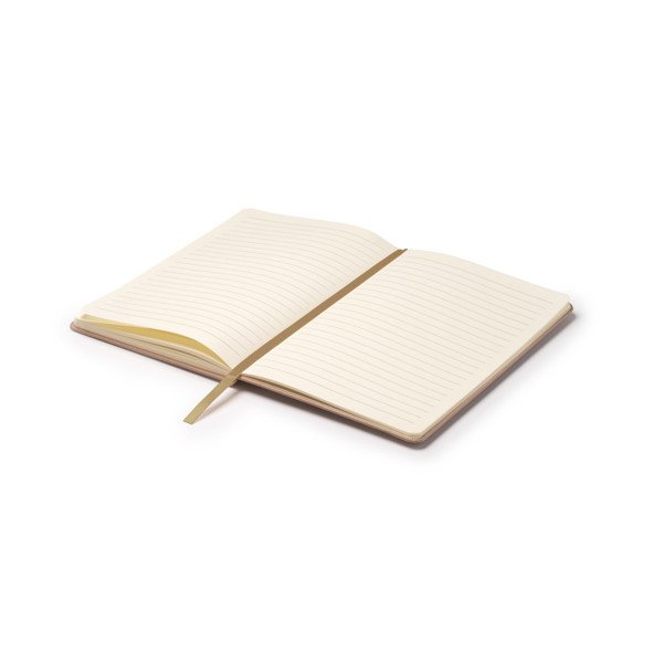 - Composición: Tapas duras elaboradas a partir de restos de frutas, con 80 hojas a rayas en su interior.
