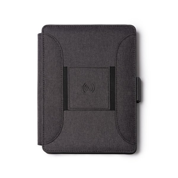 La carpeta A5 SAMPER, en RPET 300D, ofrece organización y funcionalidad. Con cierre magnético, cargador inalámbrico, bloc de notas, compartimento para móvil y soporte para bolígrafo. Presentada en caja diseño eco.