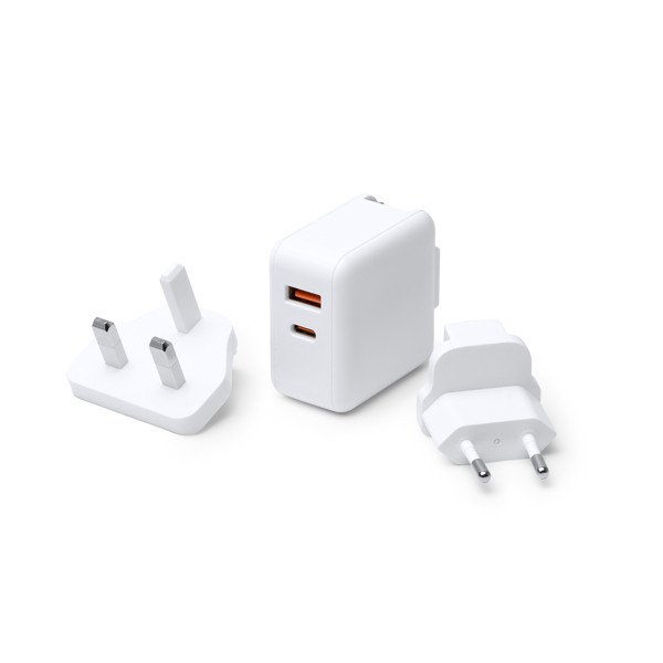 - Diseño: Adaptador de viaje universal con conectores intercambiables.