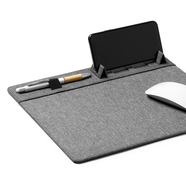 La alfombrilla DEMAR ofrece un espacio de trabajo limpio y organizado con su diseño de RPET y cargador inalámbrico de 10W integrado. Además, incluye soportes para teléfono y bolígrafo para una mayor comodidad. Presentada en una caja de diseño eco, es una elección consciente para cualquier escritorio.