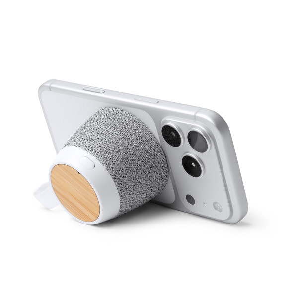Altavoz inalámbrico MONARK de 5W con cuerpo en bambú y RPET, función manos libres y soporte magnético para smartphone, ideal para regalos corporativos sostenibles.