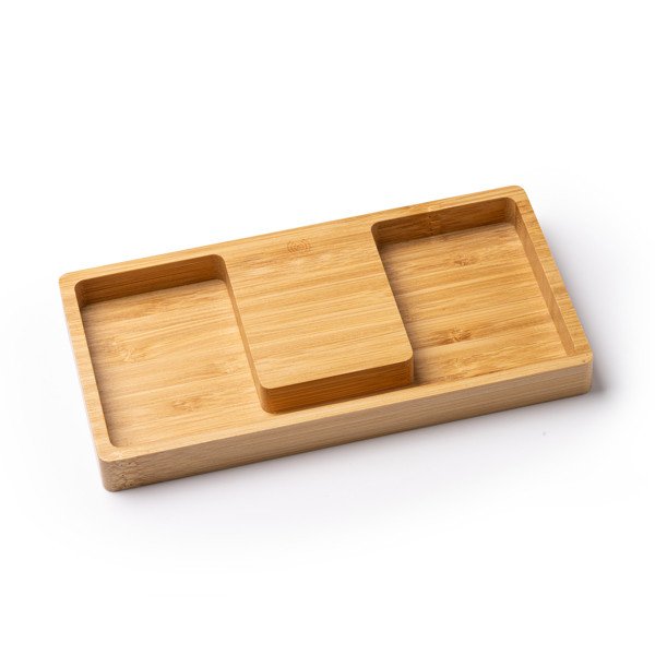 - Cargador inalámbrico de bambú en bandeja organizadora.