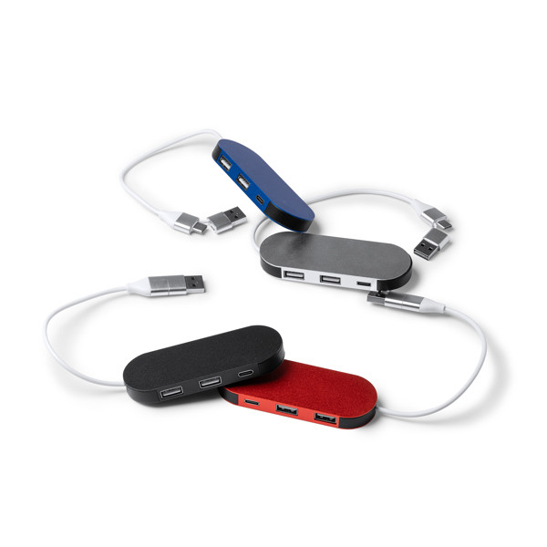 Puerto USB DORIAN fabricado en aluminio reciclado, con entrada USB y Tipo C, y tres salidas (2 USB-A y 1 USB-C). Ideal para cargar varios dispositivos de forma eficiente. Personalizable con láser. Medidas: 30 cm x 1,1 cm x 3,7 cm.