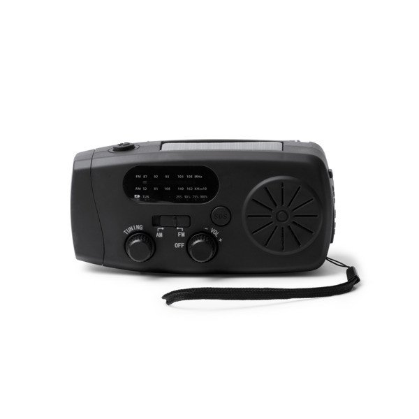 Radio multifunción NEVIL con dinamo y panel solar, linterna LED, sirena SOS y powerbank de 2.000 mAh, ideal para regalos corporativos de seguridad y prevención.