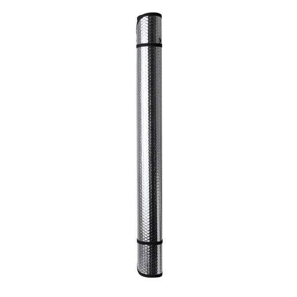 El Parasol COLUMBIA es ideal para camiones y furgonetas, con dimensiones de 180 x 90 cm. Fabricado en aluminio con acabado metalizado y ribete negro. Incluye argollas metálicas con ventosas y cintas elásticas para plegado. Presentación en plano.